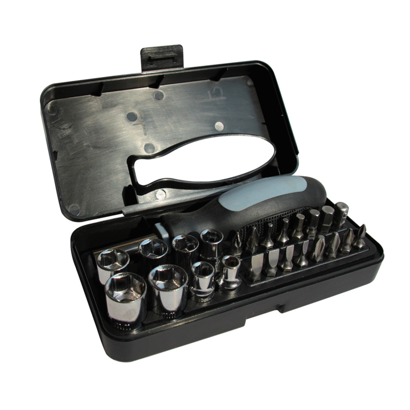 This 25-piece compact tool set is perfect for small repairs and DIY projects. It features 16 screwdriver bits, 8 sockets, and a comfortable handle, all neatly organized in a portable plastic case. With dimensions of 5.5 x 2.8 x 1.3 inches, this tool set is ideal for quick fixes at home or on the go. The sturdy case ensures secure storage and easy transportation, making it a practical tool for both professionals and hobbyists. The ergonomic design of the handle provides a firm grip for enhanced control and precision.