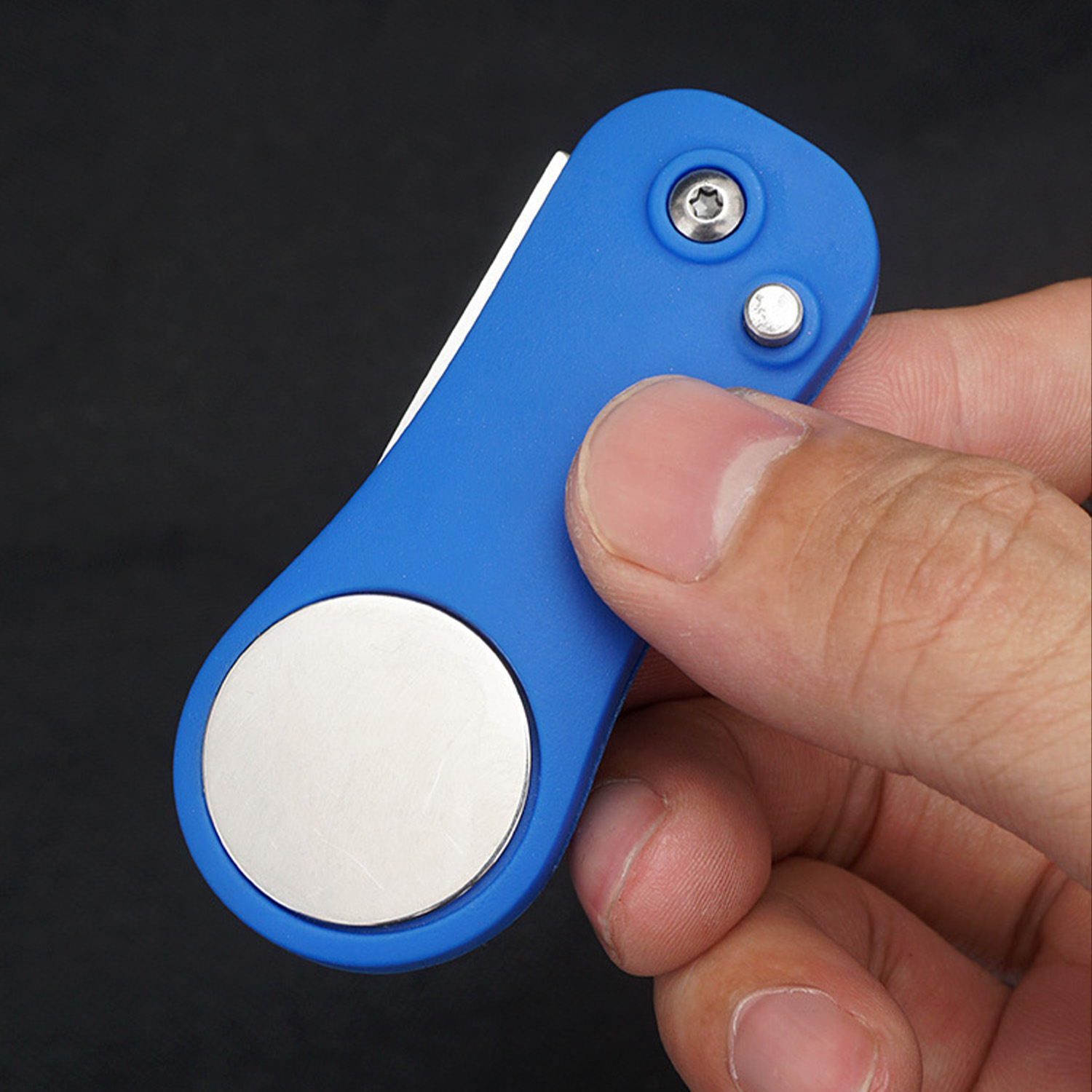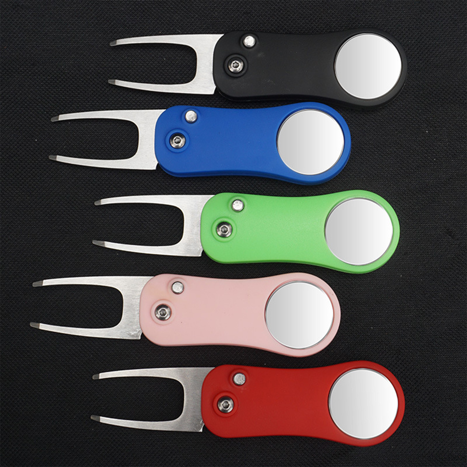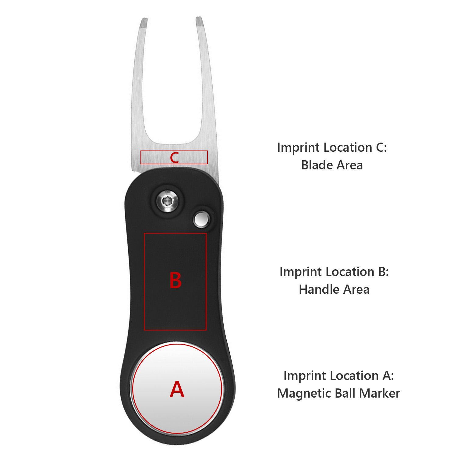 This foldable golf divot tool features a durable 420 stainless steel fork and an ergonomic ABS handle for comfortable grip. Designed with a one-touch release button for quick blade deployment and a built-in magnetic ball marker, it offers convenience and efficiency on the green. Ideal for golf tournaments, giveaways, or corporate events, with three imprint areas for customization. Measures 4.49 inches when open and folds to a compact 2.91 inches. Available in black, blue, red, green, and pink. Each piece comes individually packaged in a box.