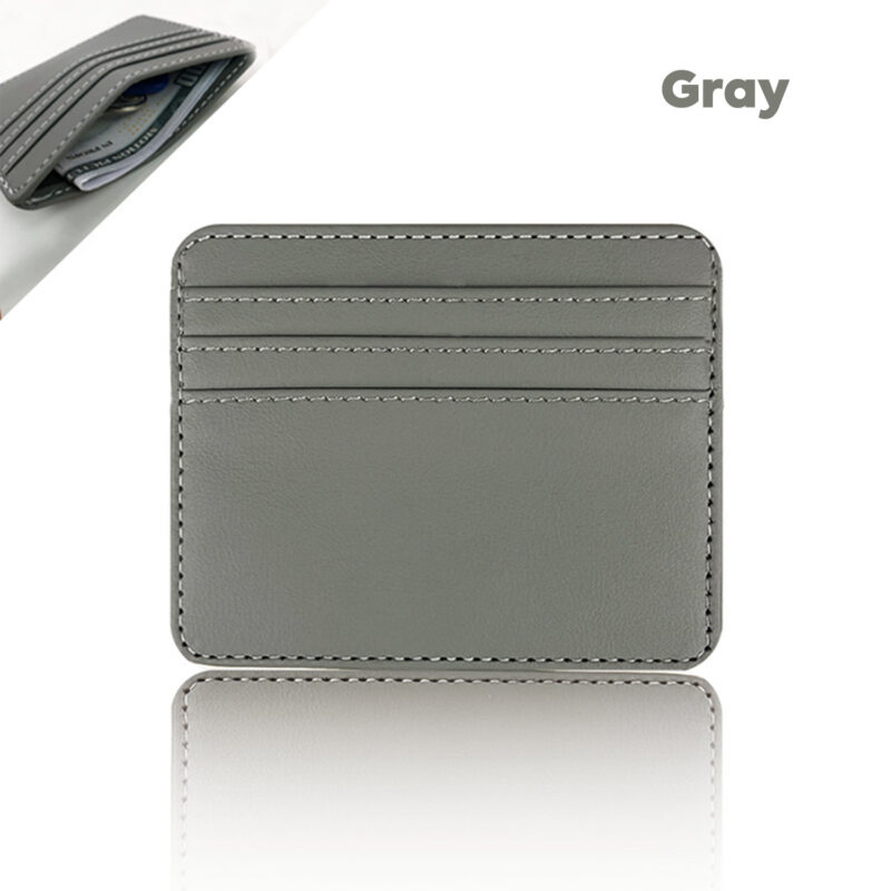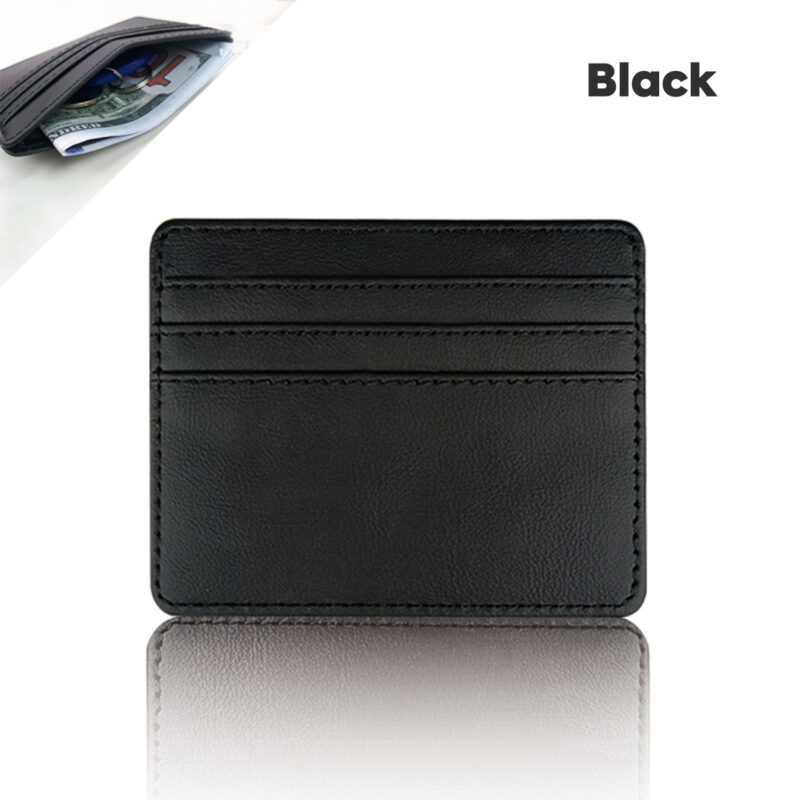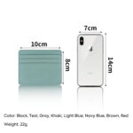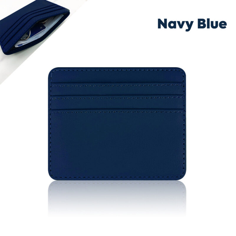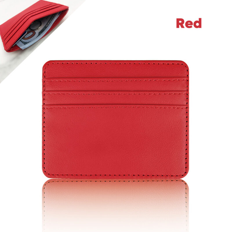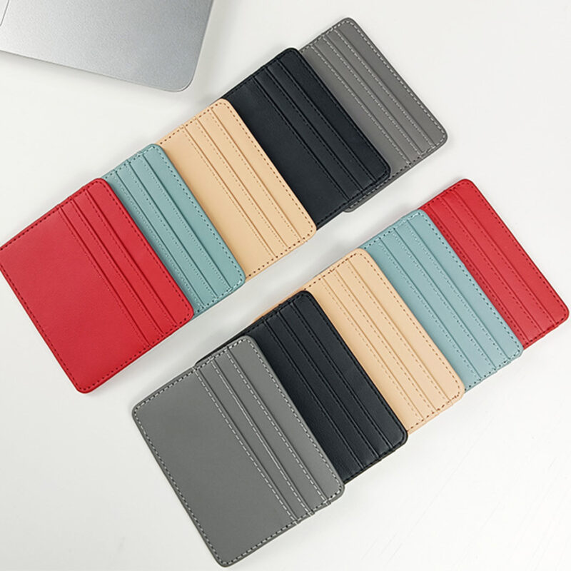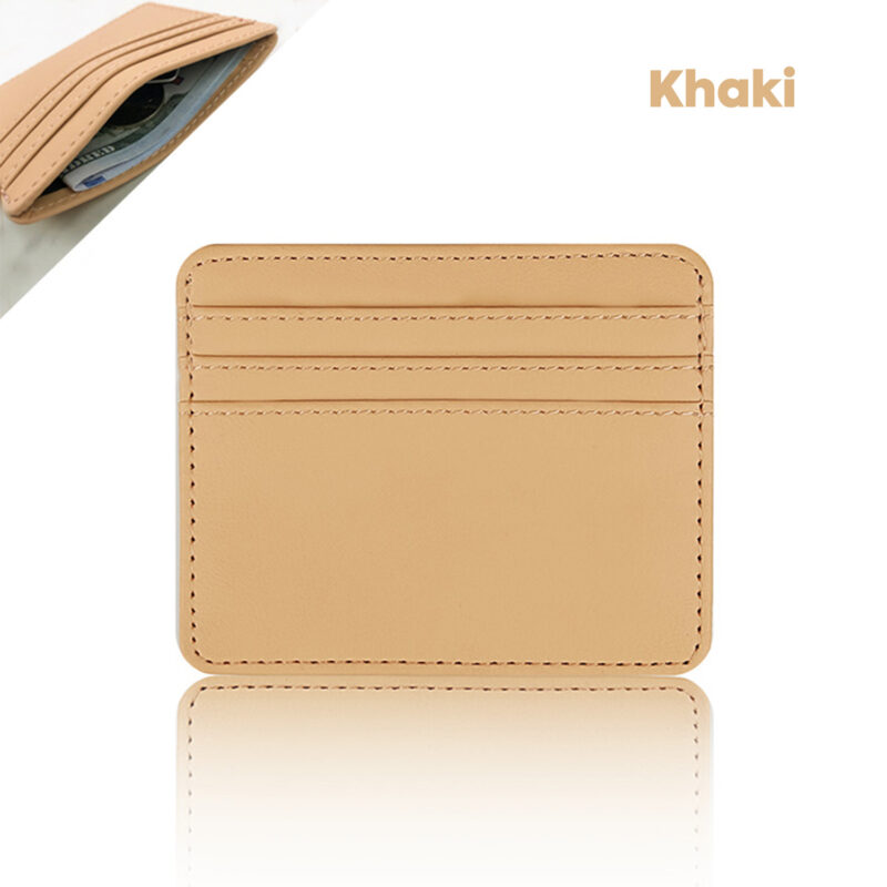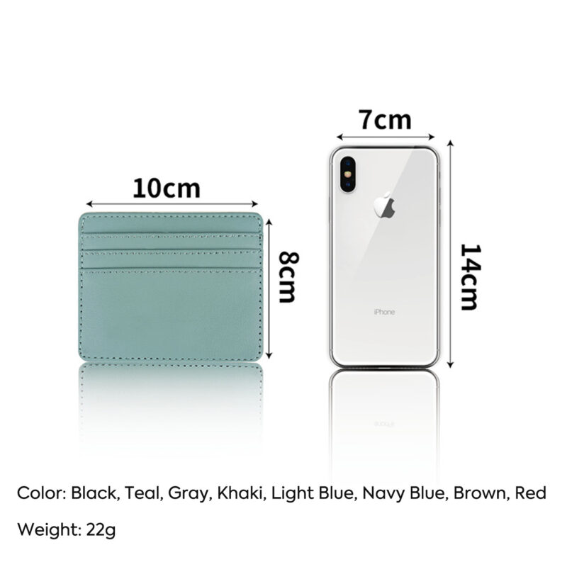 Slim PU leather card holder. Measuring 3.9 x 3.1 inches, it features 4 card slots and a central pocket for cash or receipts. The ultra-thin design ensures convenience without bulk, making it perfect for pockets and small bags. Lightweight at only 0.05 lbs, it comes in a variety of colors, including black, teal, gray, khaki, light blue, navy blue, brown, and red. Ideal for everyday use, business, or gifting, this card holder combines style and functionality in a compact format.