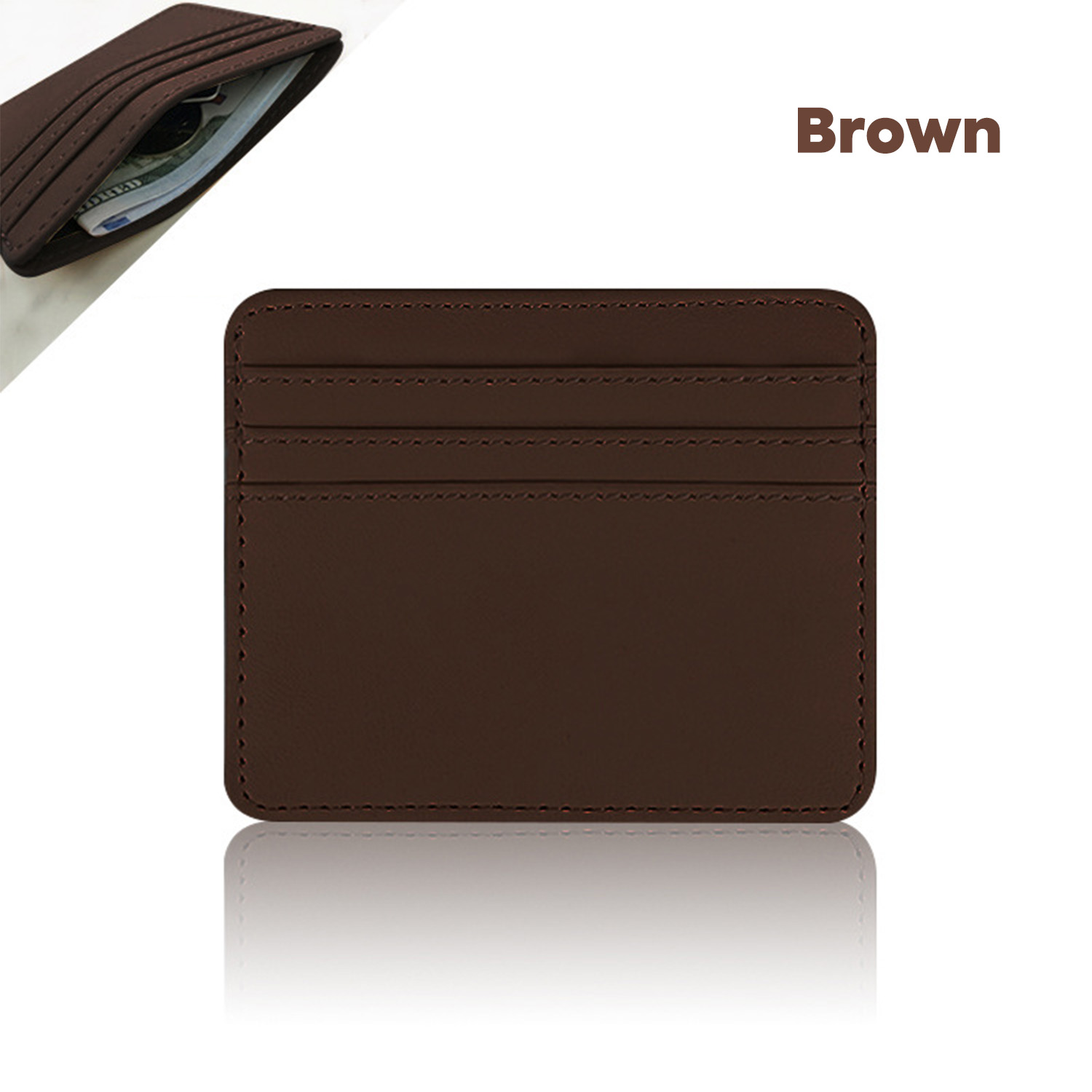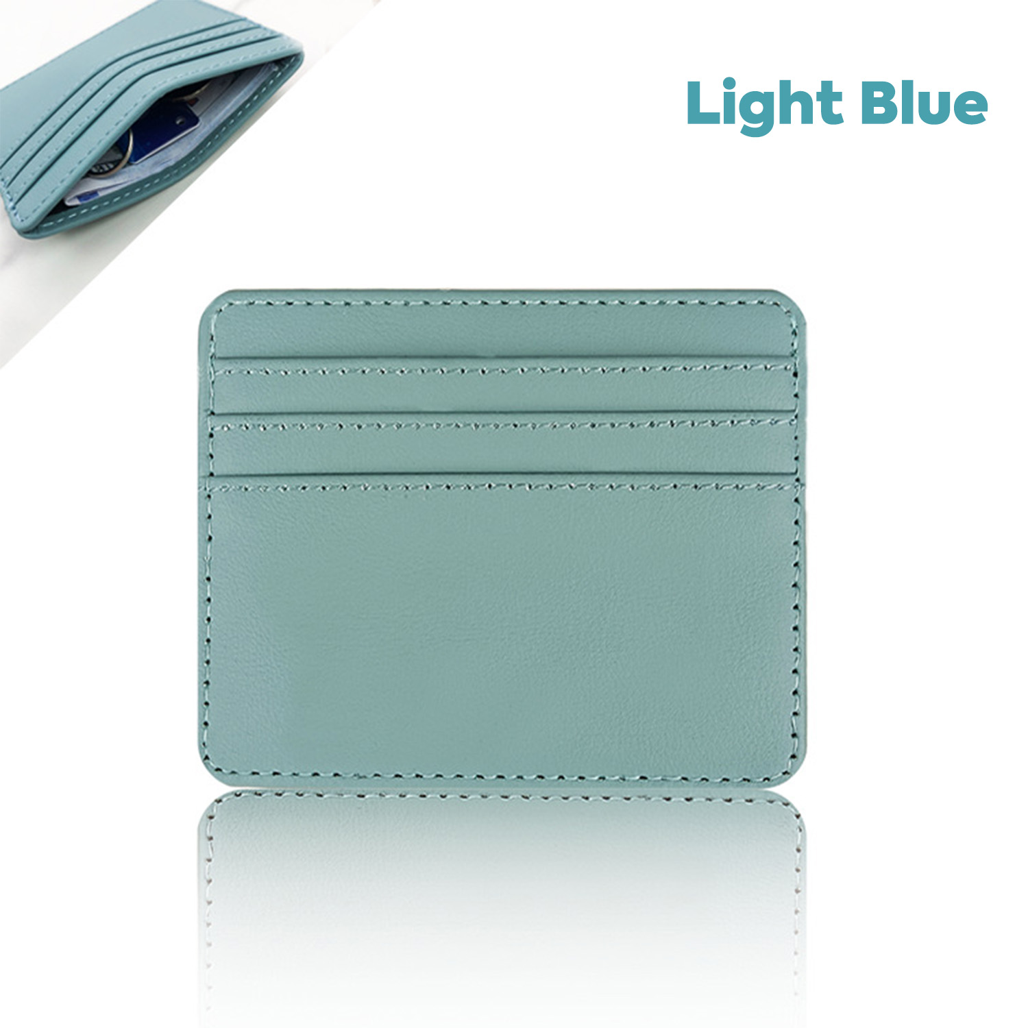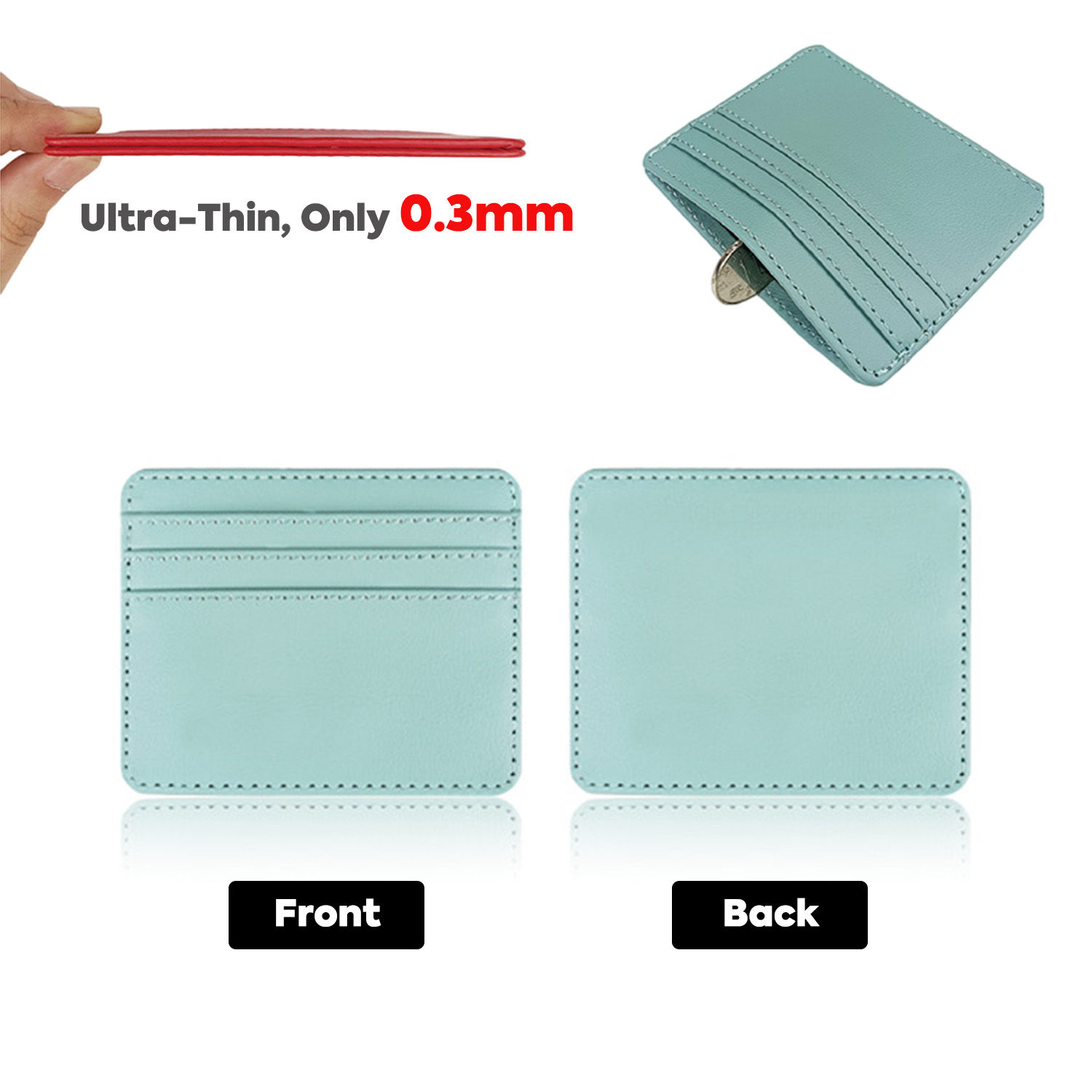 Slim PU leather card holder. Measuring 3.9 x 3.1 inches, it features 4 card slots and a central pocket for cash or receipts. The ultra-thin design ensures convenience without bulk, making it perfect for pockets and small bags. Lightweight at only 0.05 lbs, it comes in a variety of colors, including black, teal, gray, khaki, light blue, navy blue, brown, and red. Ideal for everyday use, business, or gifting, this card holder combines style and functionality in a compact format.