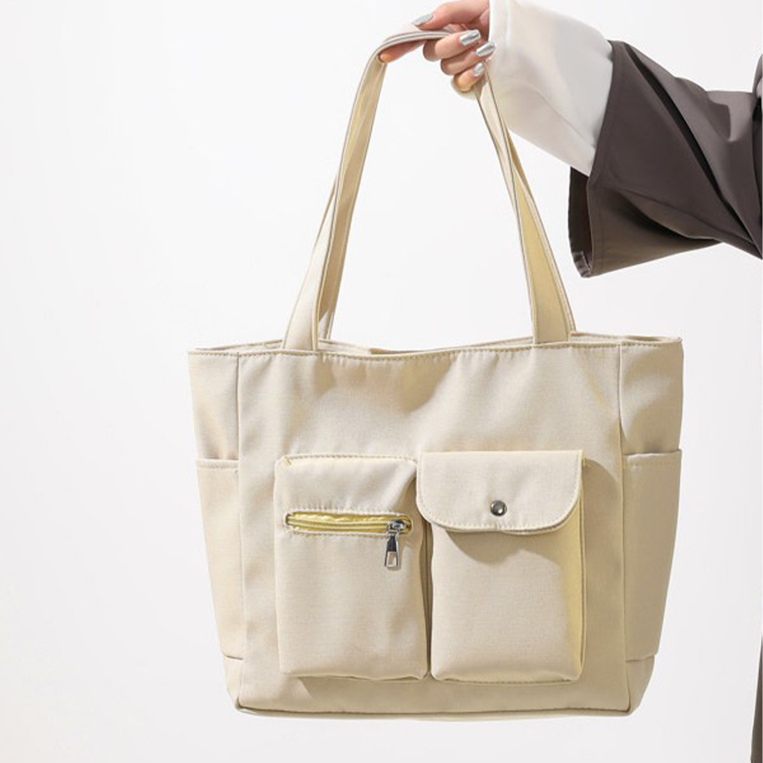 This stylish and functional nylon tote bag is designed for everyday use. With dimensions ideal for holding your essentials, it features two front pockets-one with a zipper and one with a snap closure-for easy organization of smaller items. The lightweight and durable nylon material ensures long-lasting use, making it perfect for commuting, casual outings, or travel. Its spacious main compartment can accommodate larger belongings, while the comfortable shoulder straps provide ease of carrying.