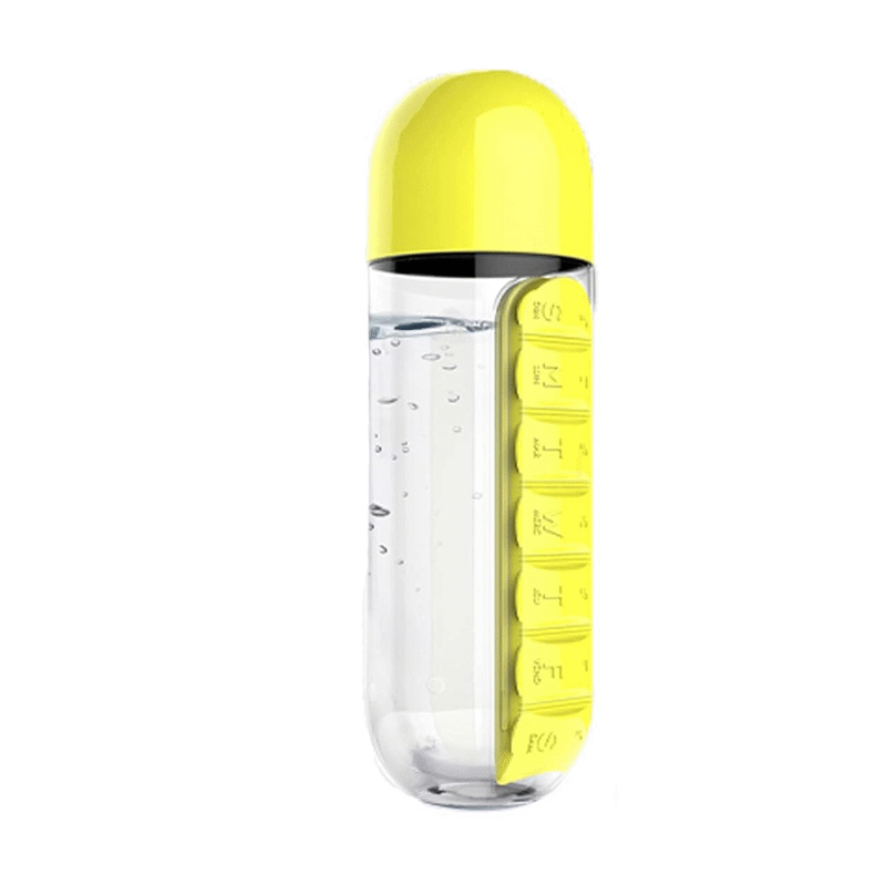 This pill box combined with a water bottle, This water bottle has helped you so much with the convenience of taking your meds with water. Cup body with elastic, hard squeeze will not break, fall-proof.Independent heel on the side corners to better prevent the cup from sliding on the desktop, and the rounded body makes it easier to put in your backpack. The pill box is made of food-grade plastic and can be slid and removed for safe storage of medication, convenient for the elderly and children to take medication anytime, anywhere.