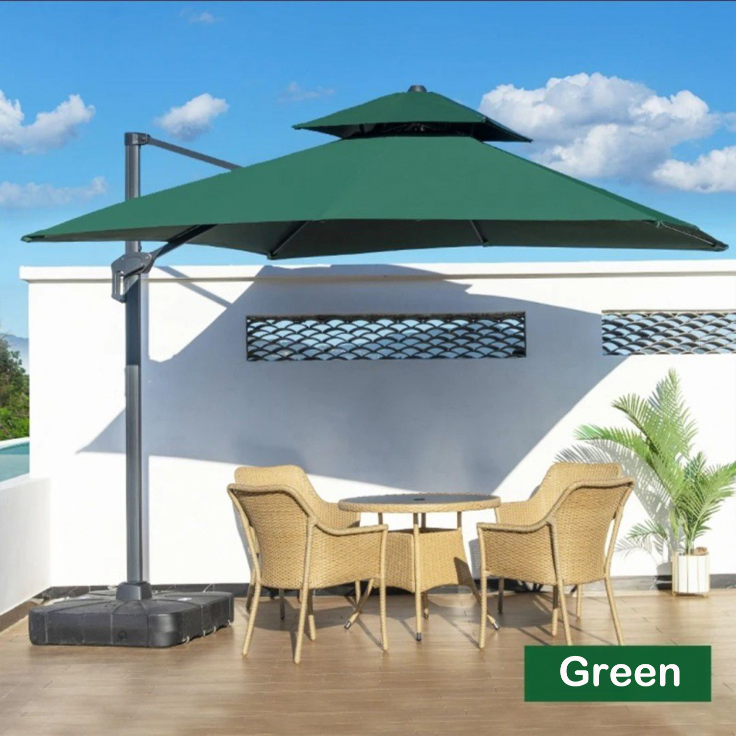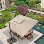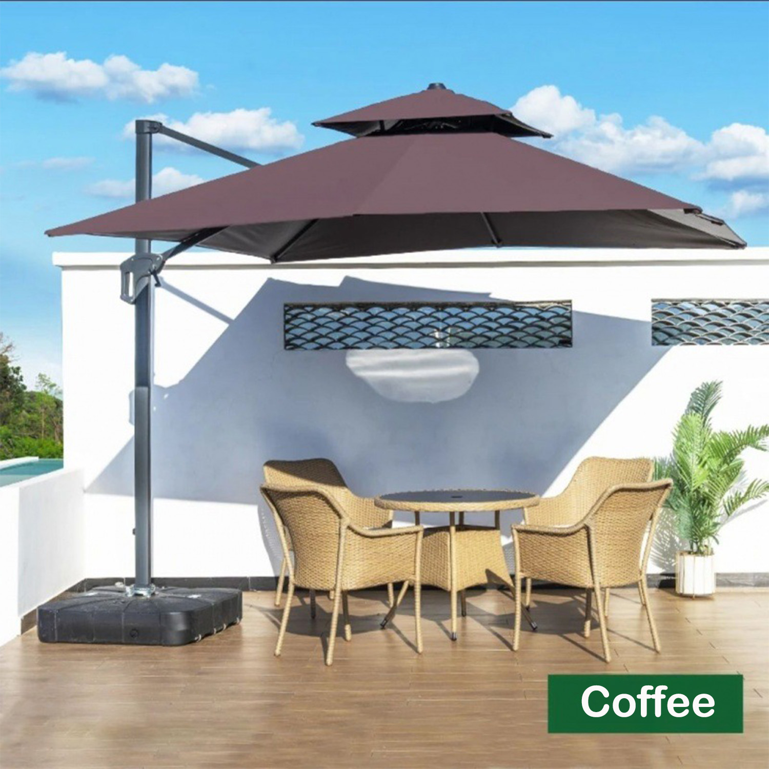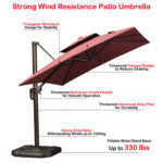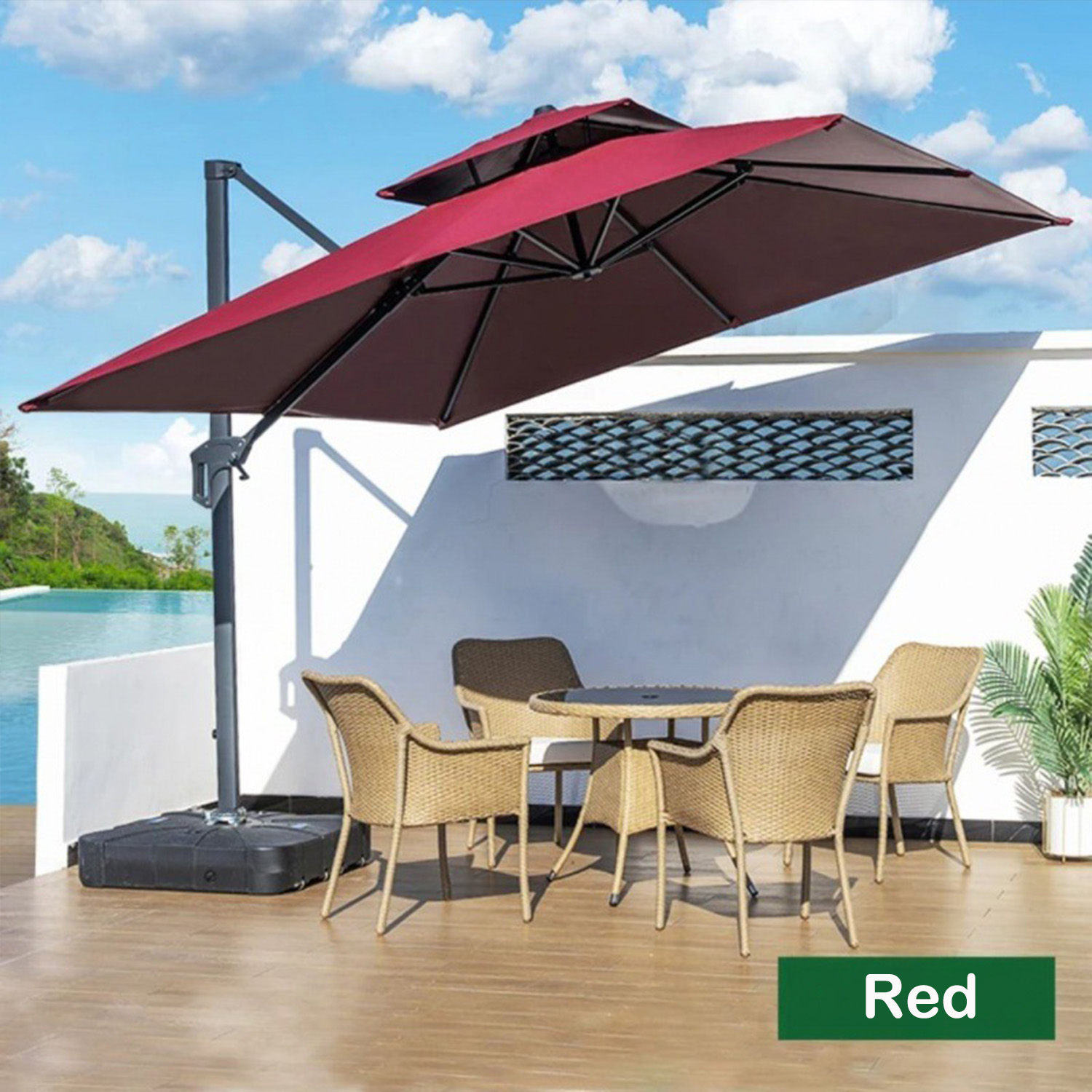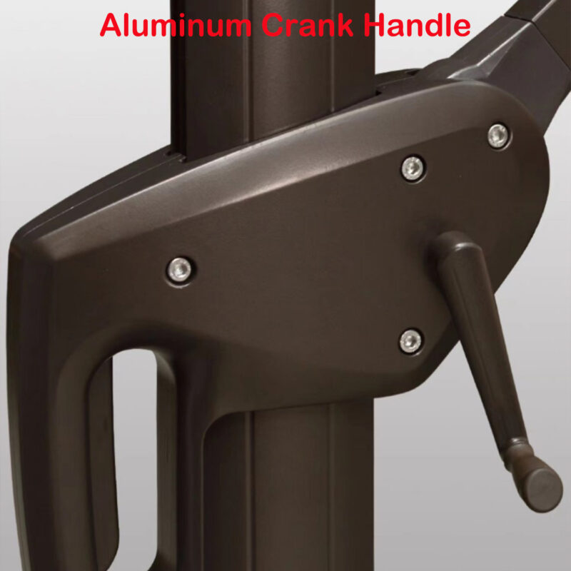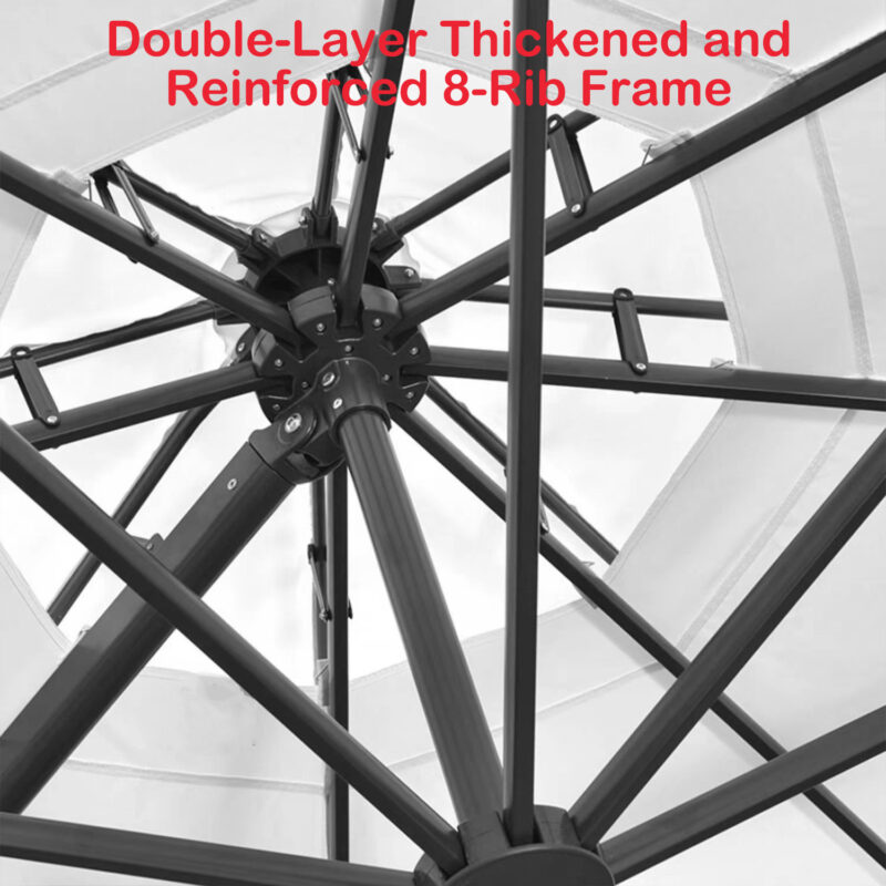 This 9ft x 9ft square patio umbrella features a thickened aviation-grade aluminum frame and a heavy-duty 260g yarn-dyed polyester canopy with PU coating for enhanced UV protection and water resistance. The umbrella is supported by a reinforced 8-rib double-layer frame and triangular structure for superior wind resistance and stability. A smooth-turn aluminum crank handle ensures easy lifting and closing. The base can be filled with water or sand, reaching up to 330 lb for secure placement. Ideal for patios, balconies, gardens, and outdoor cafes.